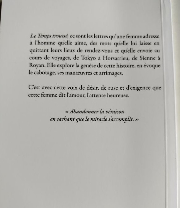 Son titre Le Temps troussé – quelques lettres. Son éditeur À Contre-pied Éditions.